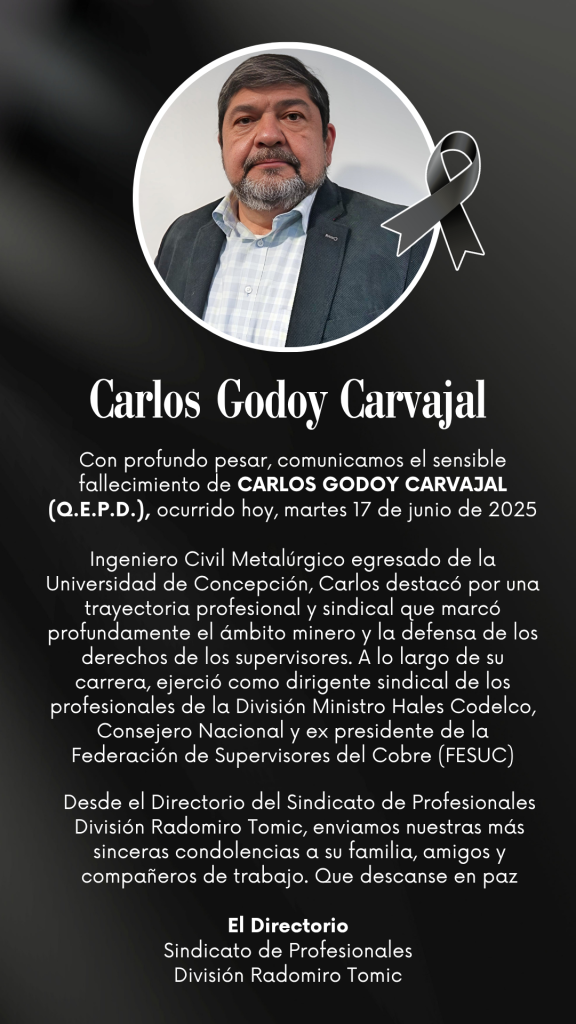 Como Sindicato de Profesionales de la División Radomiro Tomic, enviamos nuestras más sinceras condolencias a su familia, amigos y a todos quienes compartieron con él su profesionalismo, compromiso y vocación sindical.